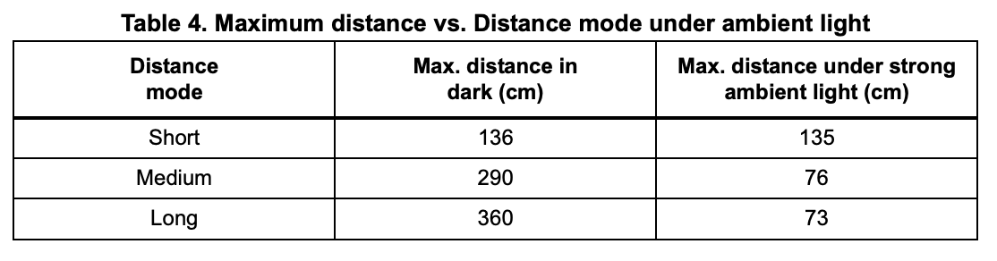 Comparing the short, medium, and long distance modes, we see that each mode has its own pros and cons. As seen in the images from the datasheet below, the short mode sees the shortest distance, but also performs the best under strong ambient light. It also allows for 20ms sensor readings, which allows for fast loop times. Medium mode doubles the distance compared to short mode, and long mode triples the distance. However, these modes require longer sensor readings and under strong ambient light they perform worse than short mode. Ultimately, I choose short mode since the fast measurements are crucial for the car and most obstacles should be within 1.3 meters.