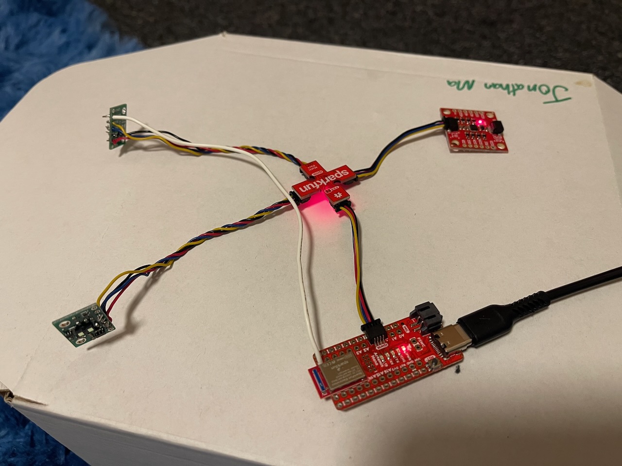 For the car, I was given 2 ToF sensors. I decided it would be best to put one sensor at the front of the car and one on the right side of the car in order to maximize the coverage of obstacles. So to see obstacles on the back and left of the car, we would have to rotate the car. For the wiring, I decided to use the 2 longer QWIIC connect wires for the ToF sensors since they were more position sensitive than the IMU or the QWIIC breakout board (which will use the short wires). Below is a wiring diagram showing how the all the sensors will be connected. Since we have 2 ToF sensors which will both have the same default I2C address, we will connect one of the ToF’s XSHUT inputs to the Artemis’ GPIO pin. This allows us programmatically turn off one of the ToF sensors when the Artemis starts up so that we can change the other sensor’s default I2C address.