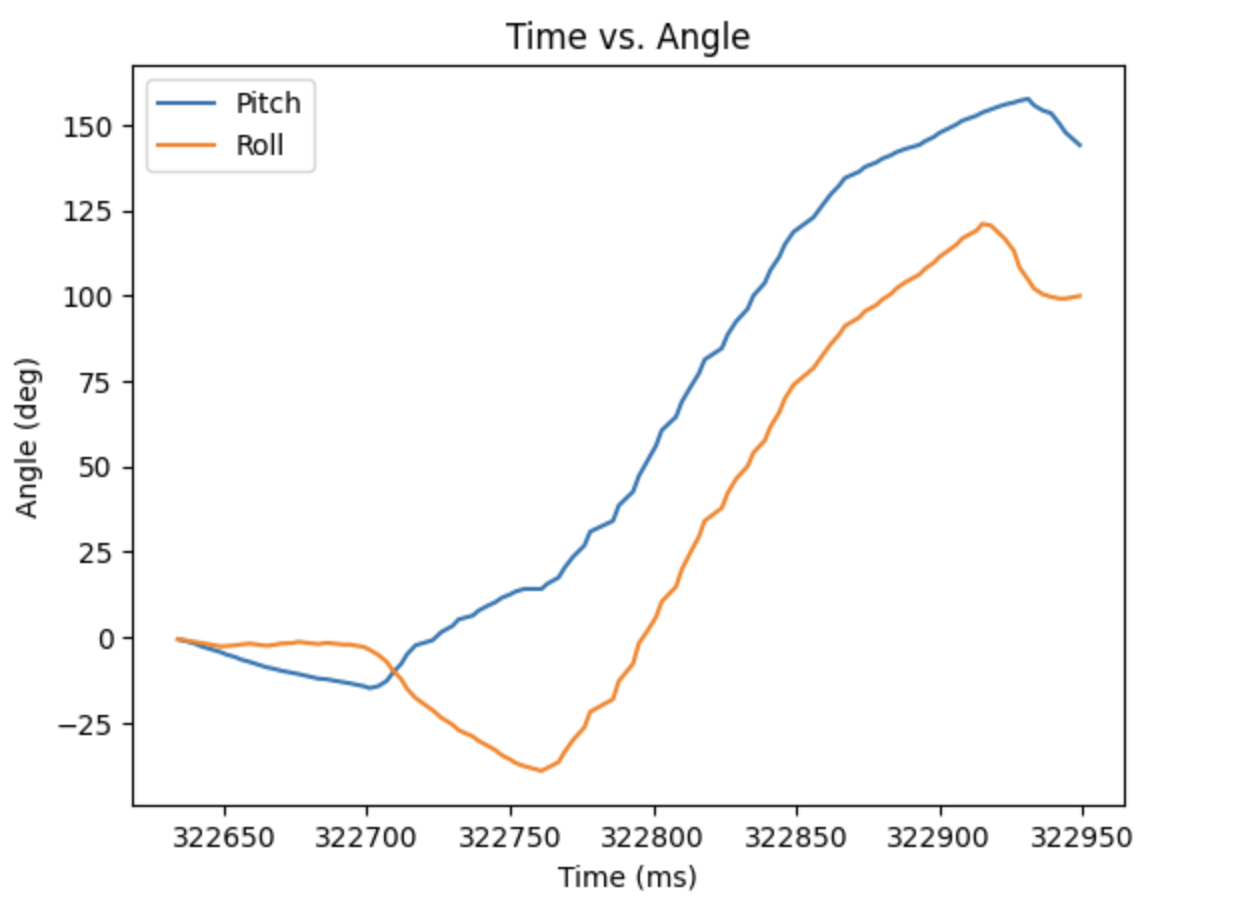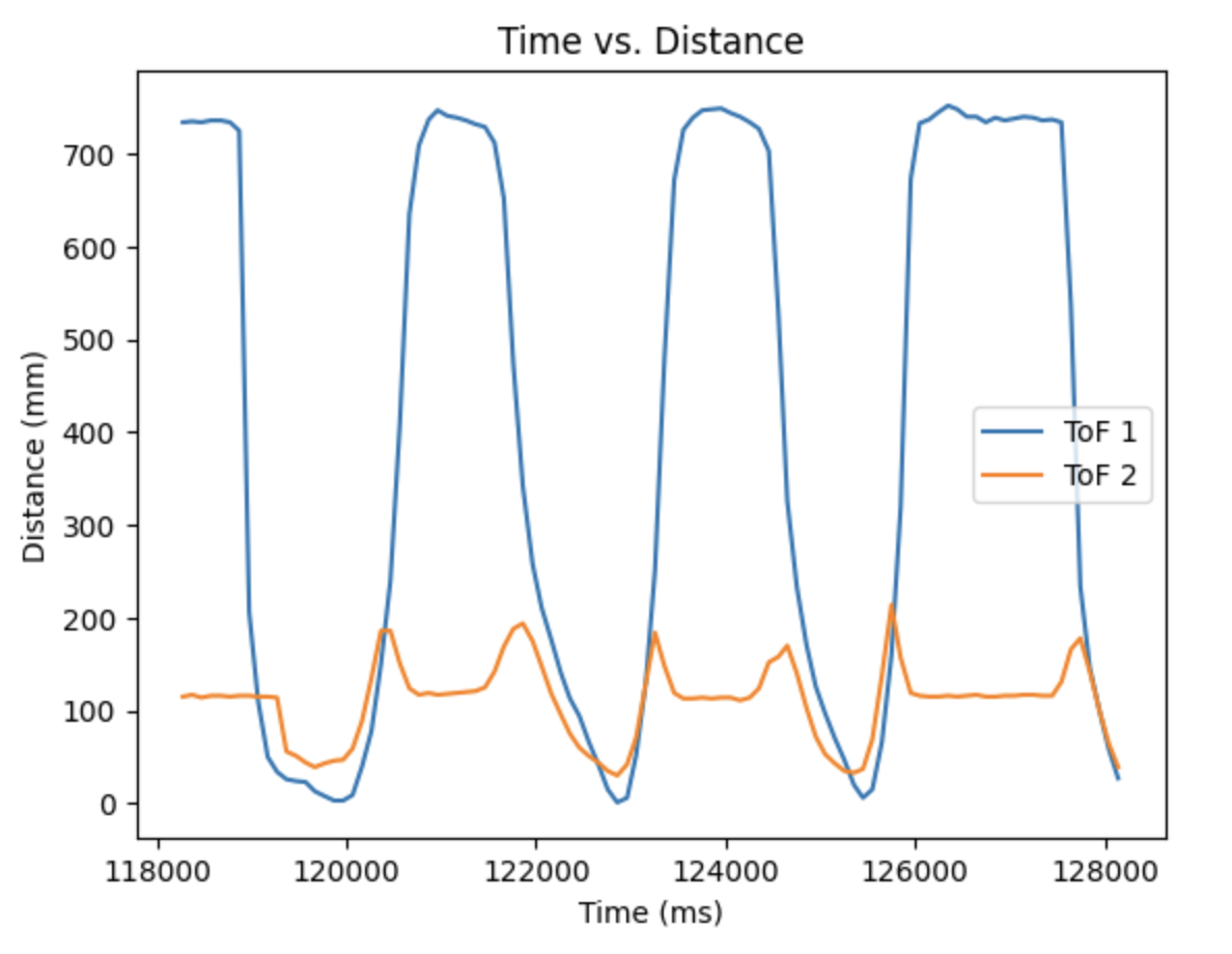The plot to the left shows data points from the 2 ToF sensors graphed versus time, while the plot to the right shows IMU pitch and roll to show that my previous code was not affected.