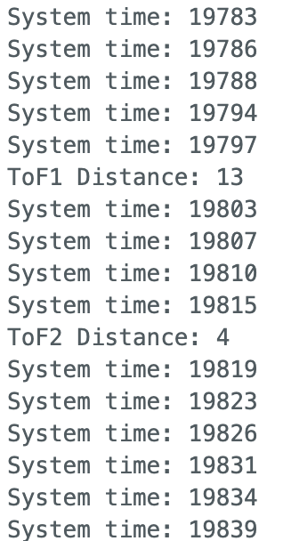 To evaluate the speed of my main loop with the ToF sensors, I used the following code. This code uses continuous mode so we only need to call startRanging() once at the start. The screenshot below shows the output of this code, and we can see that the loop time is roughly 3-5ms.
