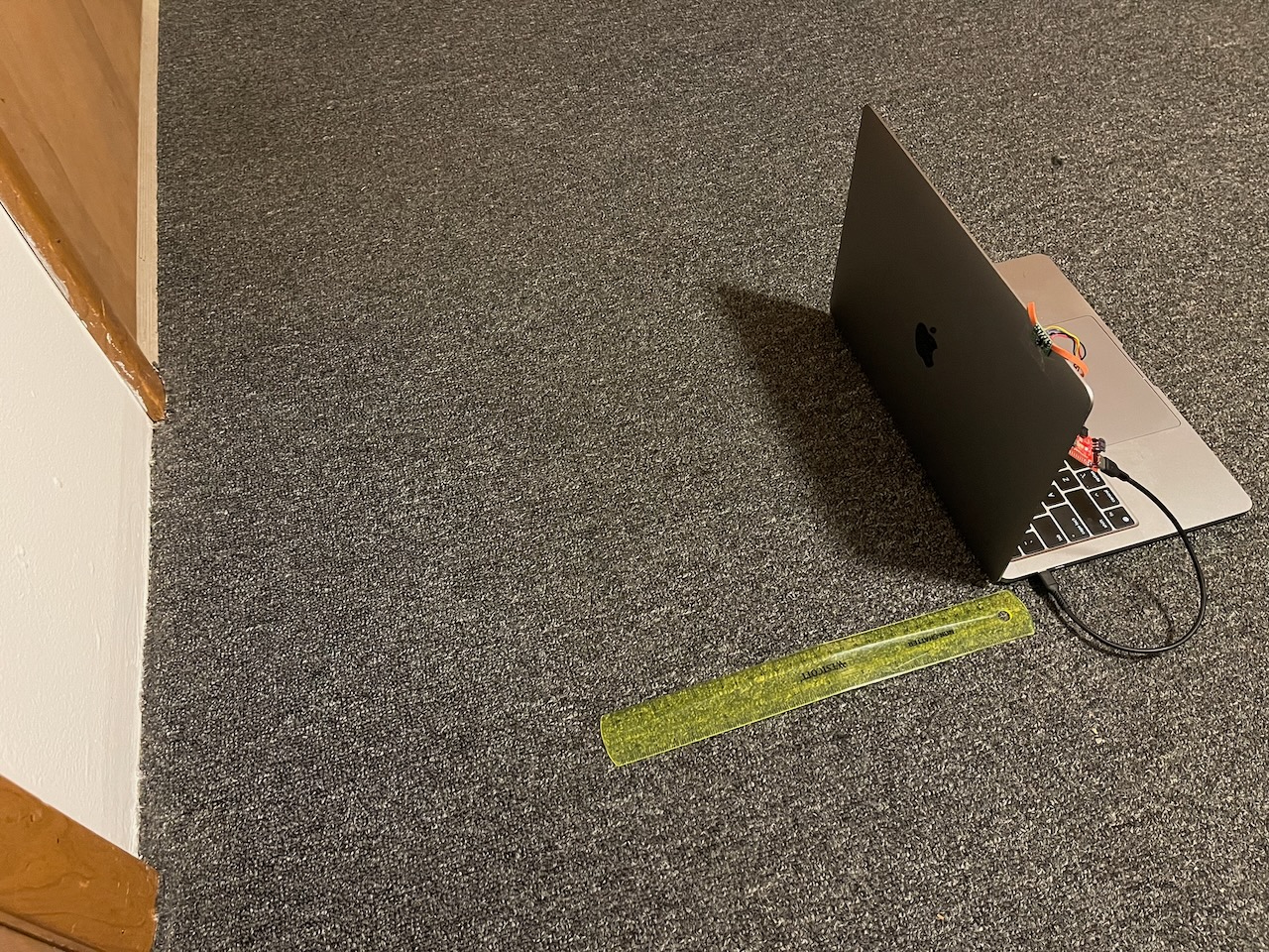 To test the ToF sensor’s accuracy, repeatability, and ranging time, I used the following setup where I taped the sensor to the back of my laptop I measured the distance between it and a wall with a ruler.