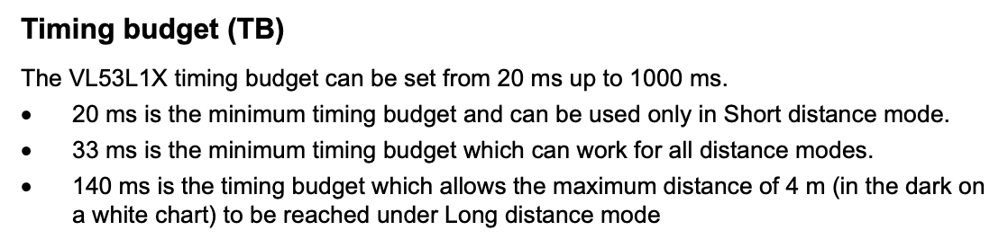 This shows that as the distance increases, the repeatability decreases slightly. And for ranging time, using the example code I get a ranging time of 50ms for all distances below 135cm. Above 135cm, the ranging time is 30ms, but that is probably because the sensor is just estimating the distance.