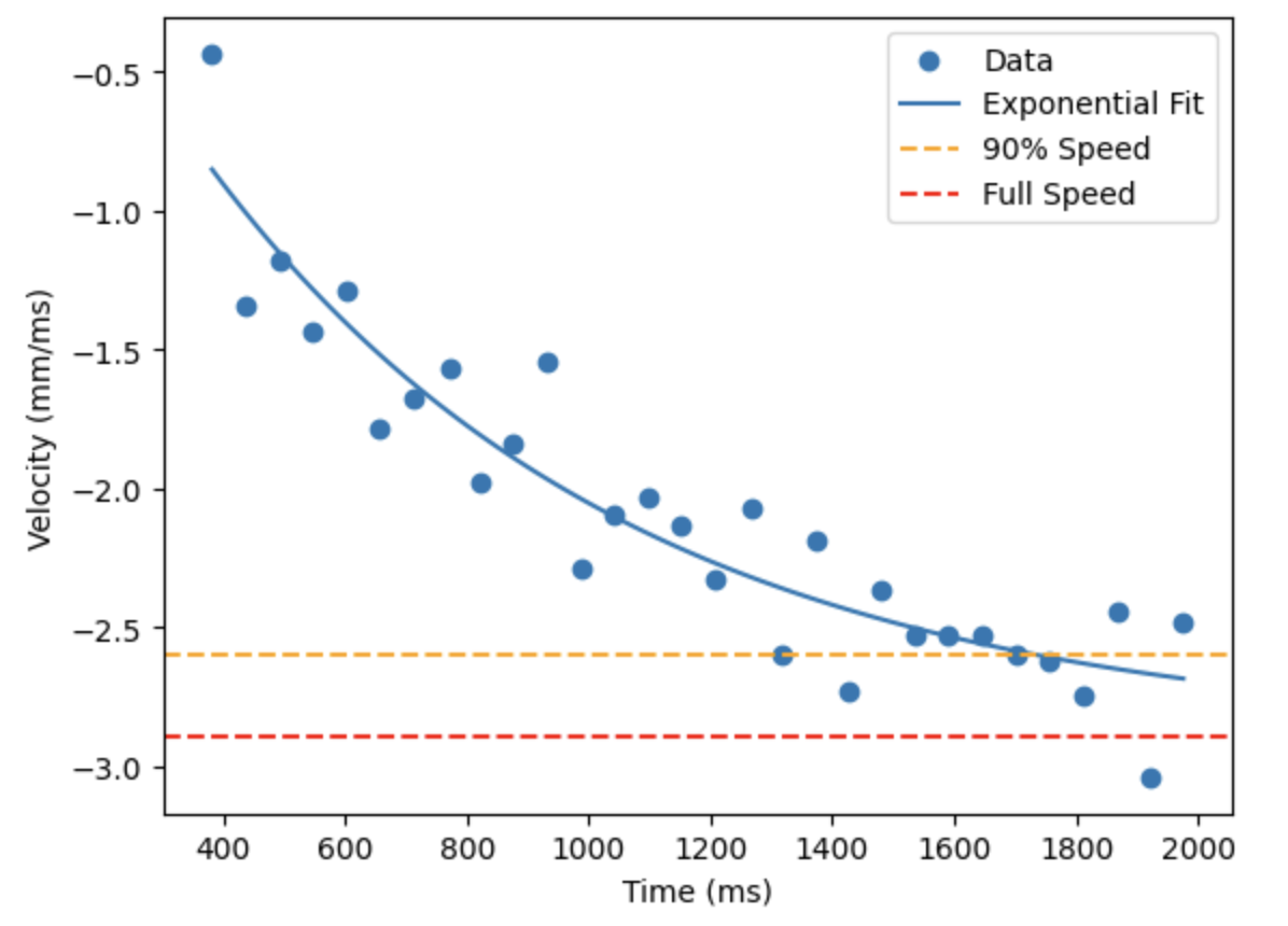 To find the drag, the car needs to have reached a constant speed. However, since the car never reached constant speed during my testing, I calculated this by computing the exponential fit of the velocity data and finding the asymptote, which is shown below. For simplification, $u$ is set to 1, which gives us $d = \frac{u}{\dot{x}} = \frac{1 N}{-2.89 m/s} = -0.346 kg/s$. To find the mass, I first found the 90% rise time by finding the intersection of the exponential fit line with the 90% of the steady state speed, so $t_{0.9} = 1.739 s$. So, $m = \frac{-d \cdot t_{0.9}}{\ln 0.1} = -0.261 kg$.