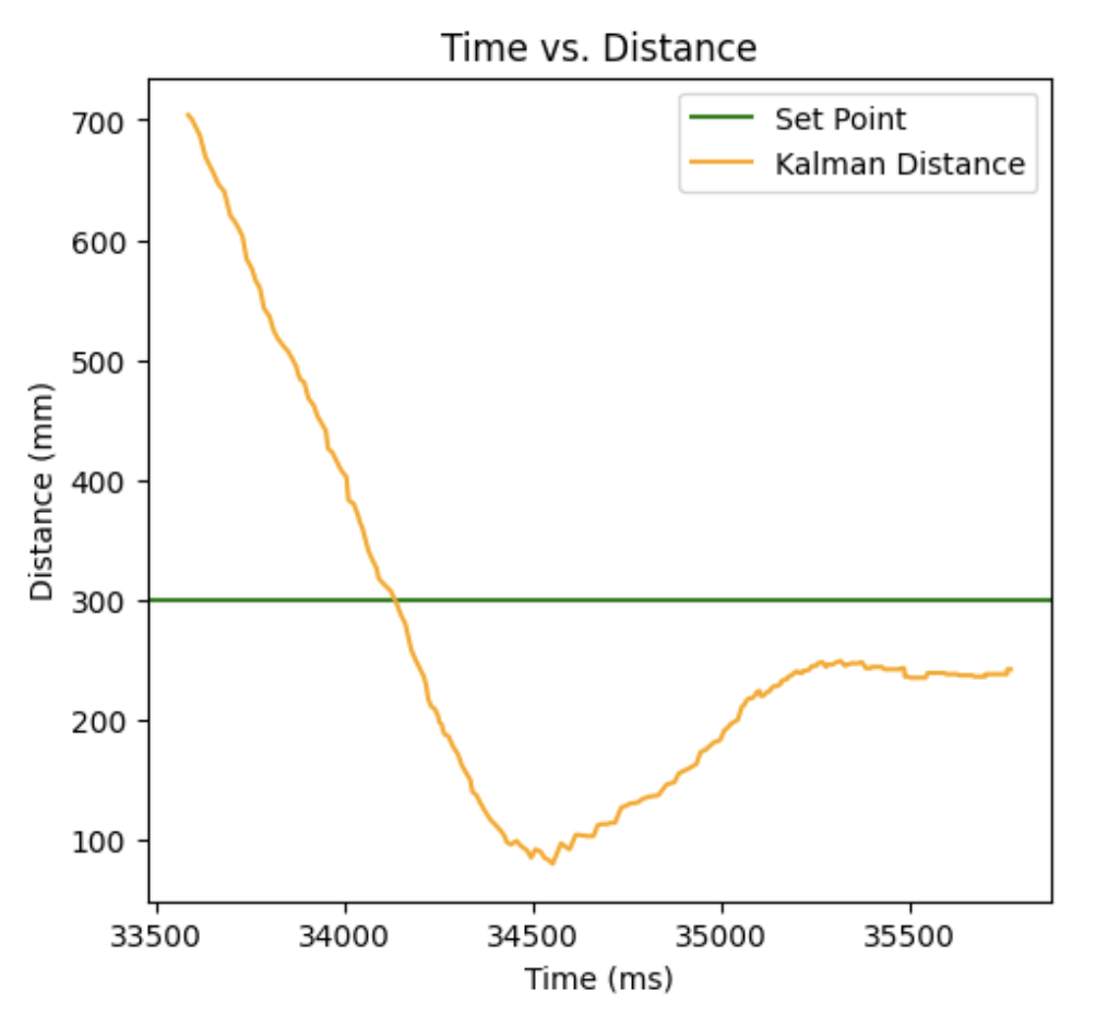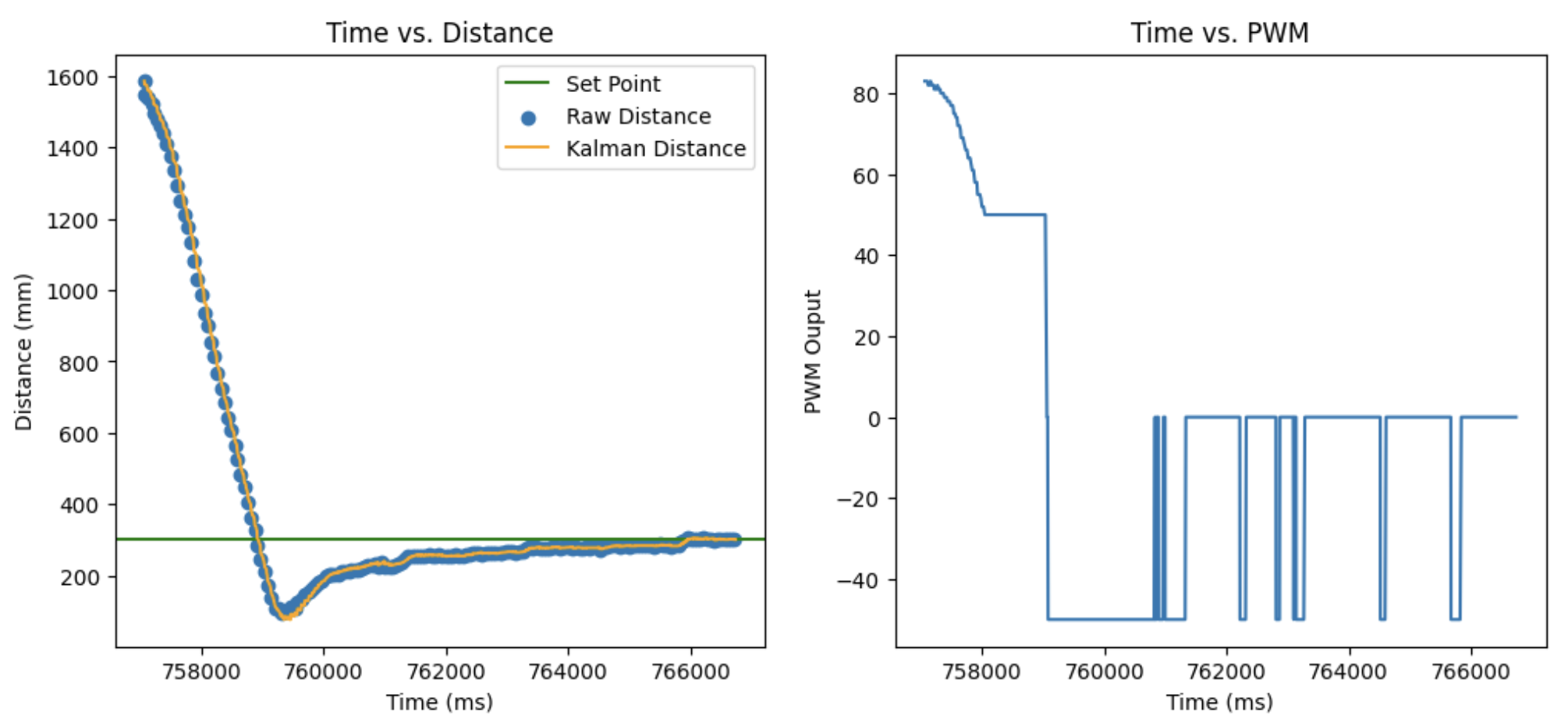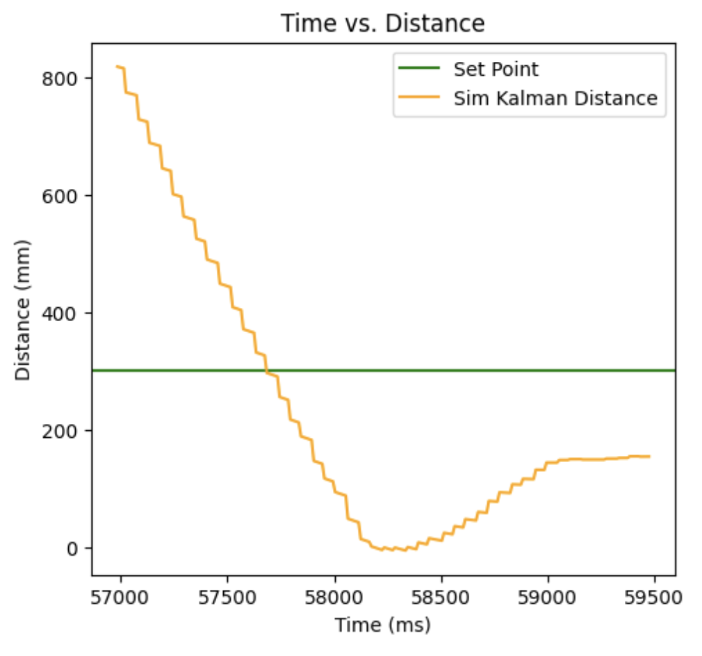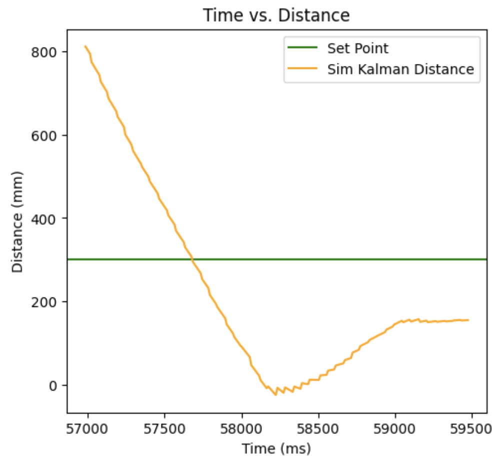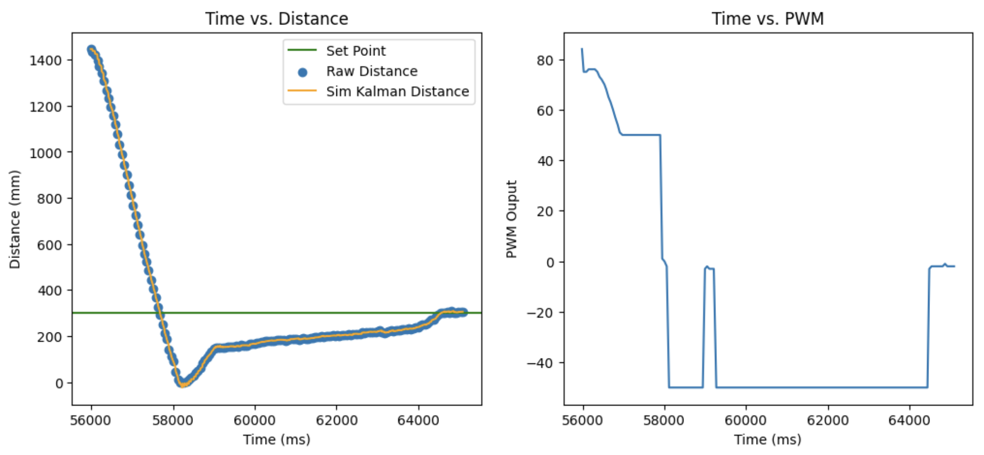 Below is a full graph of the simulated Kalman filter running with ToF and PWM data collected from a run of the linear PID, which shows the filter tracking the raw ToF data very well.
