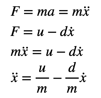 Before we can implement a Kalman filter, we first need to build a basic model of our system. Using Newton’s Laws as seen in lecture, we can derive the dynamics of our system, where $u$ is the control (PWM) input, $m$ is the mass of the car, $d$ is the drag on the car, and $\dot{x}$ the change in distance over time.