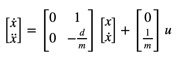 We can then rewrite these dynamics into the form $\dot{x} = Ax + Bu$ to get our state space equations, where $A$ is the state matrix and $B$ is the control input matrix. In this case our state $x$ is represented by our current position and velocity, so $x = \begin{bmatrix} x \\ \dot{x} \end{bmatrix}$. Below are the state space equations for our system.