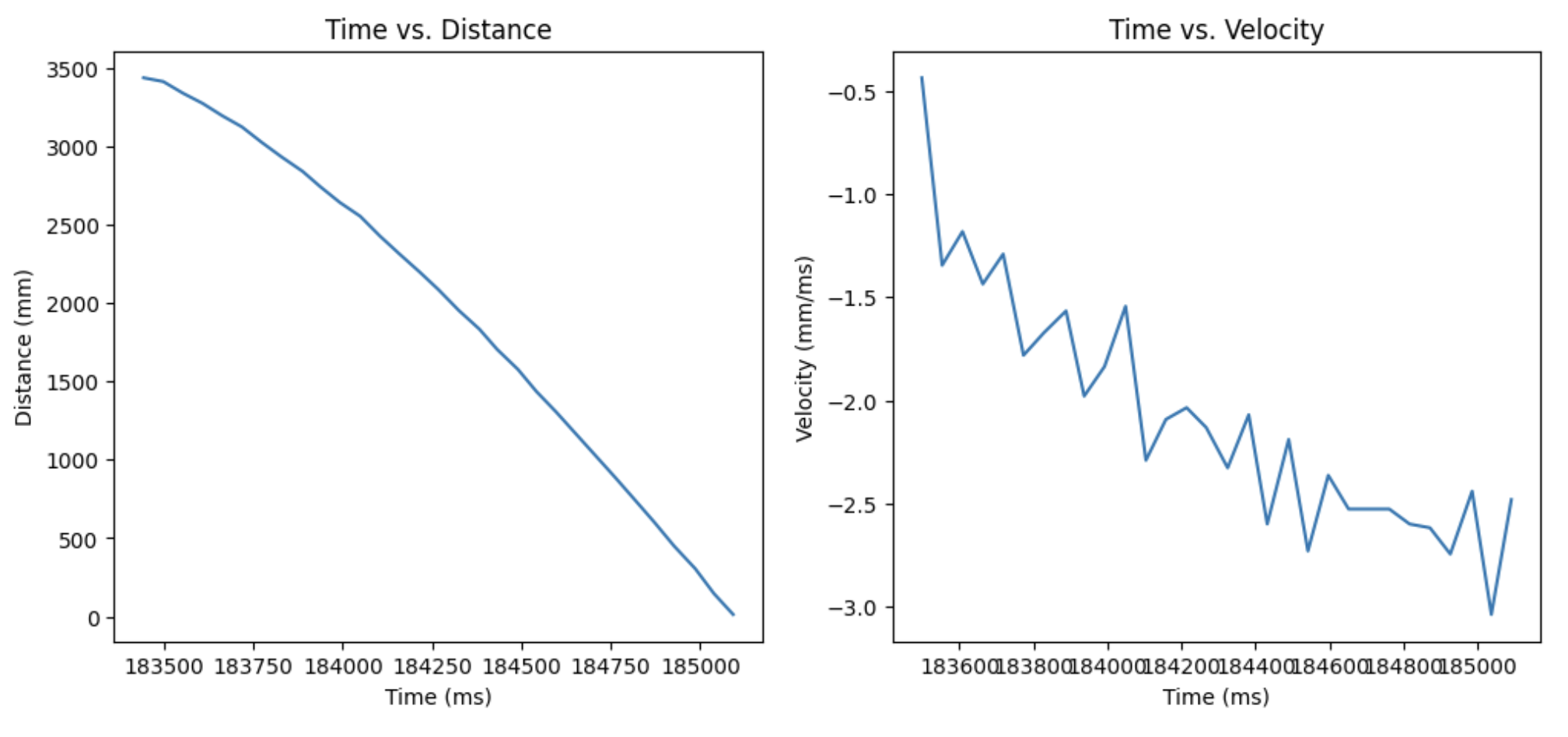 To estimate the drag ($d$) and mass ($m$) terms, I performed a step response with the car where I drove the car forward towards the wall at a PWM value of 130, a 50% duty cycle, while recording raw ToF data. I then computed the derivative of the ToF measurements to get the velocity of the car at each timestep, and cut off the noisy data right as the car starts and at the end when it crashes into the wall.